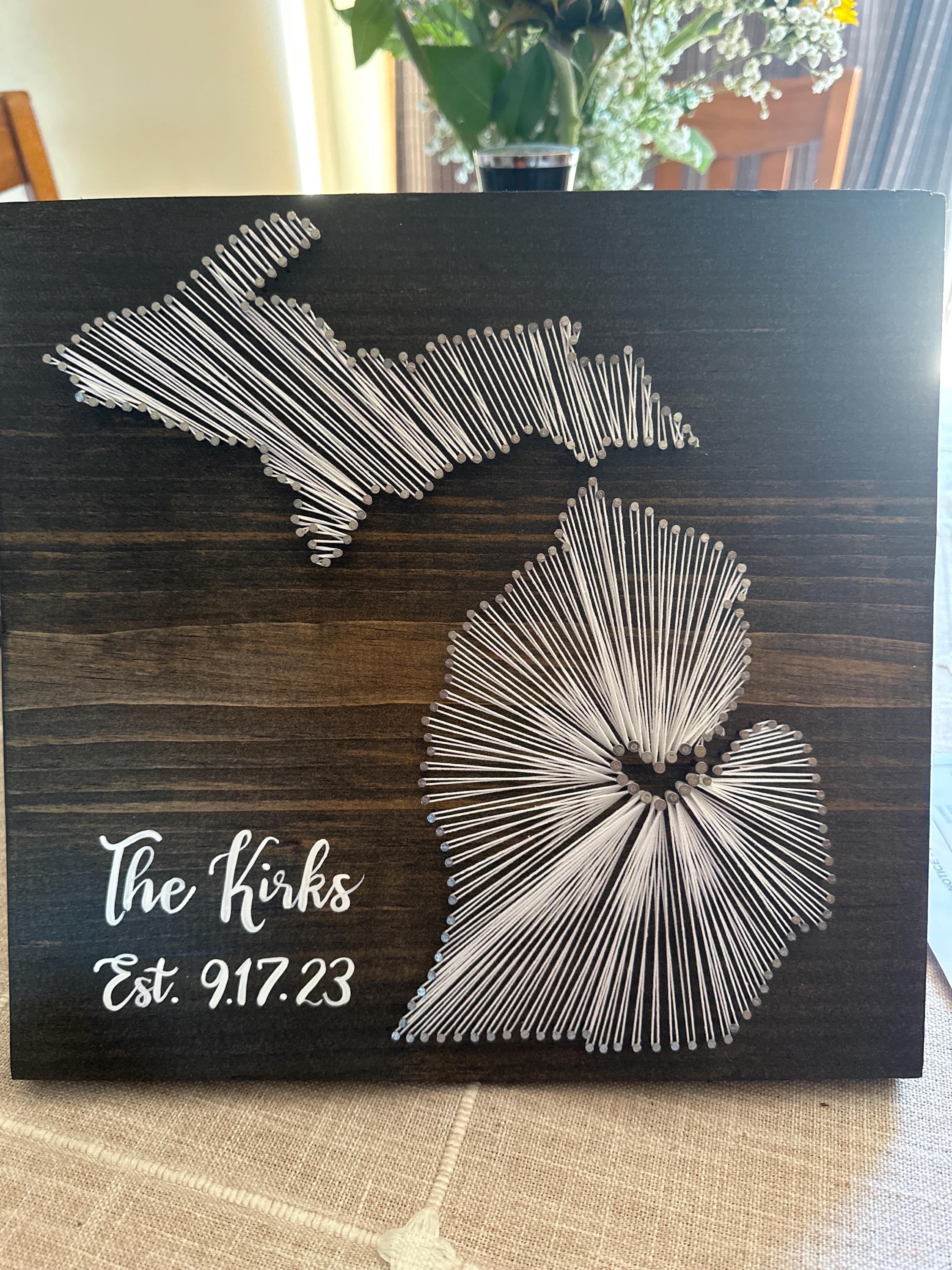 Give someone a one-of-a-kind gift with this custom-made string art state sign, featuring any state and city. The heart can be placed over any place special to you, whether it's where you were born, where you were married, where your kids live, where you went to college. There are so many possibilities! Military families or those who move around a lot have also enjoyed ordering multiples to showcase all the places they've lived.