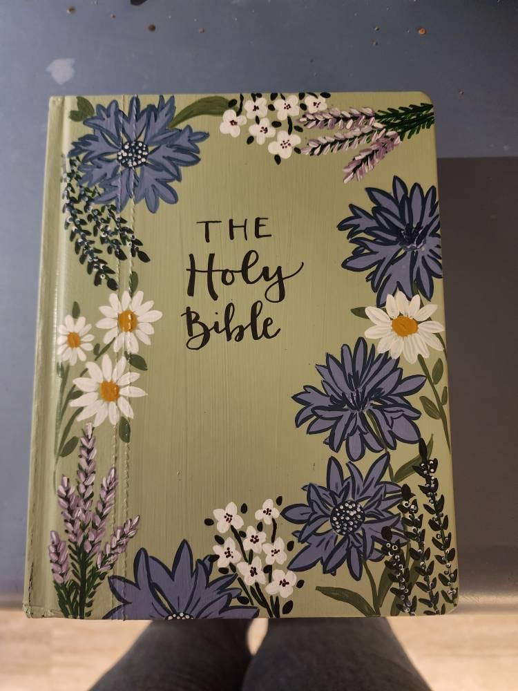 Regardless of design chosen, you may choose any verse to be hand lettered on the back of the Bible. I can also hand paint your name on the spine of the Bible. This info may be included in the comments/notes section of your order at checkout.