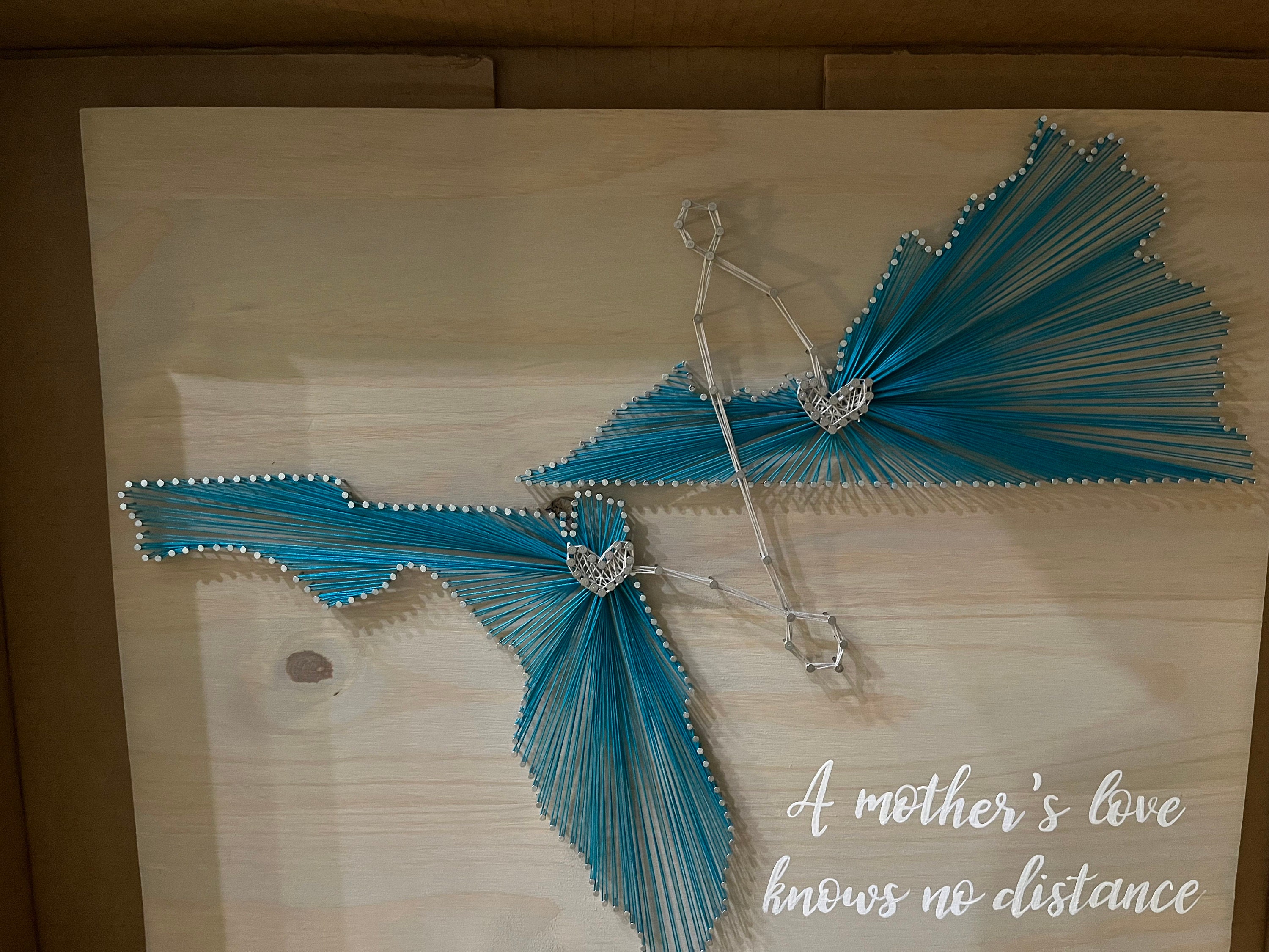 The phrase “A mother’s love knows no distance” will be hand painted in white calligraphy in the open space on the board. Please note that the location of the phrase may vary based on what looks best with the design.